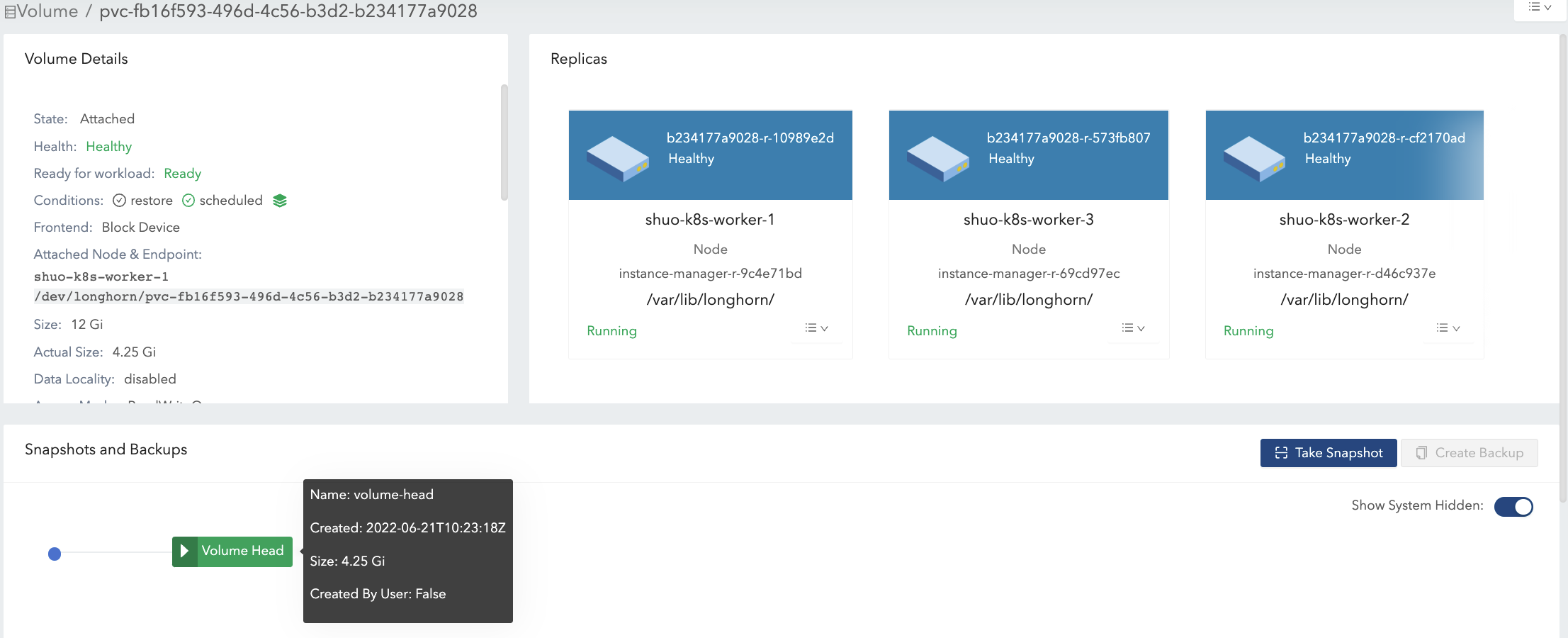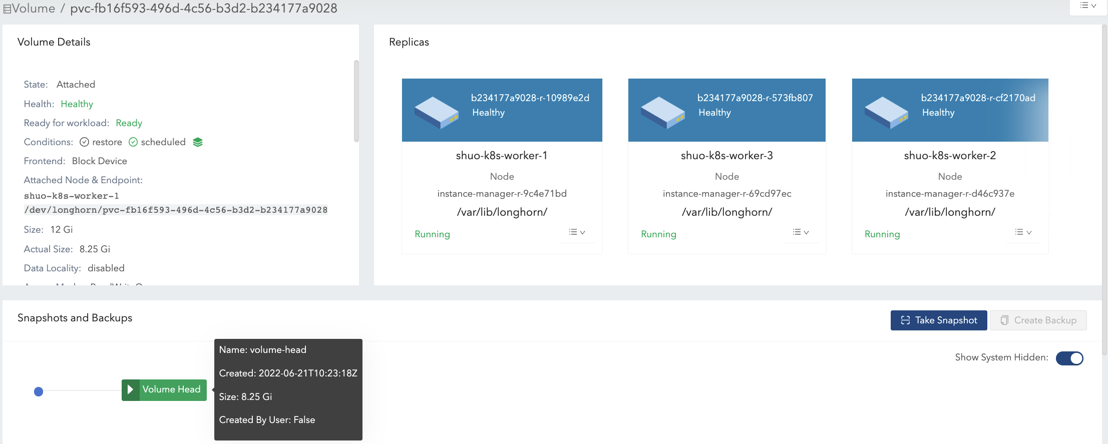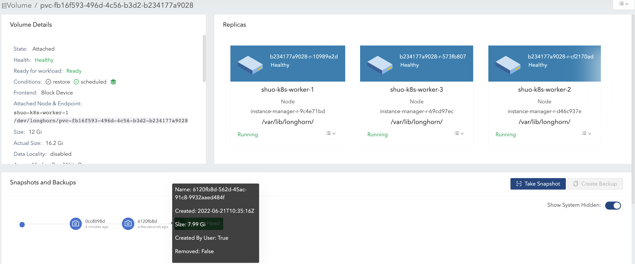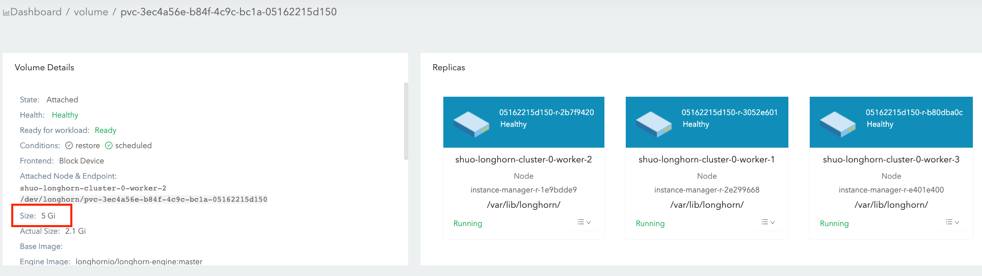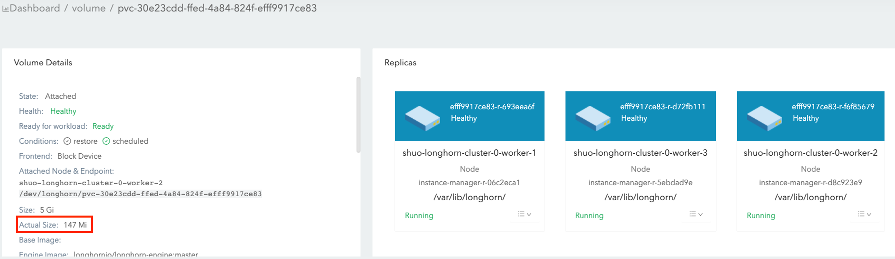 • The volume itself is just a Kubernetes CRD object and volume data is stored in replicas. This value represents the nominal size of each replica.