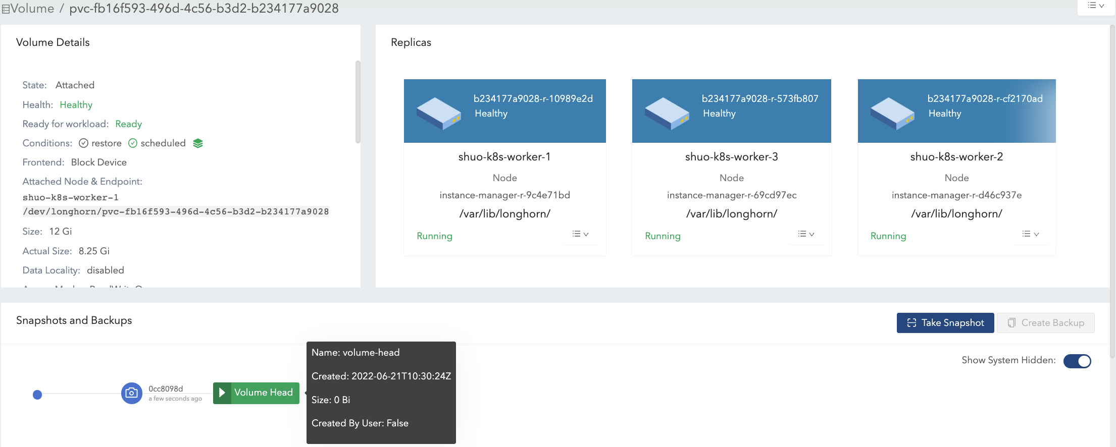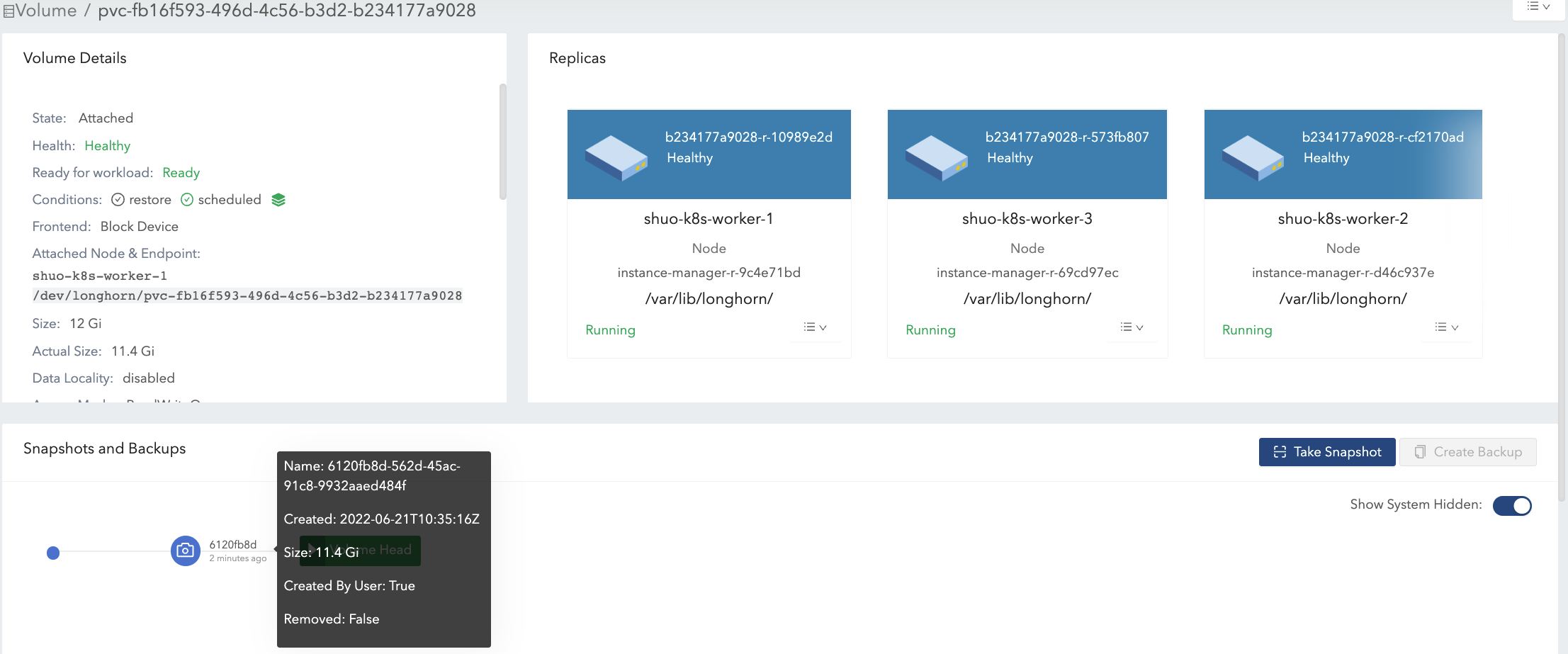 1. Create a 12 Gi volume with a single replica, then attach and mount it on a node. See Figure 1 of the illustration.