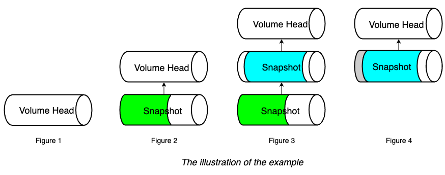 Size and volume Actual size:Here, we will have an example that explains how volume size and actual size get changed after a bunch of I/O and snapshot related operations.